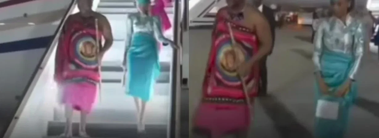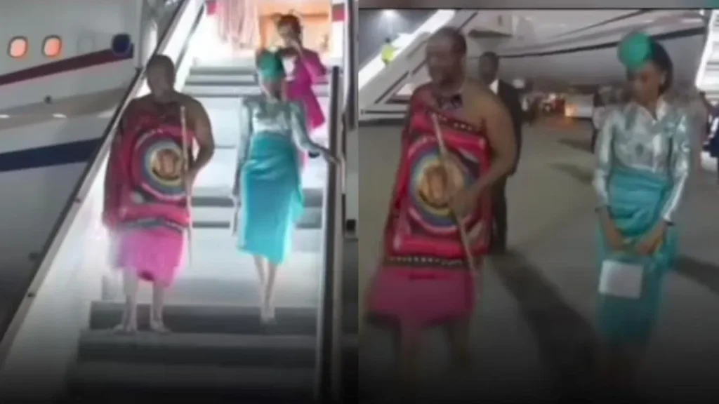 fun factorss ಹೆಸರಿನ ಇನ್ಸ್ಟಾಗ್ರಾಮ್ ಖಾತೆಯಲ್ಲಿ ಶೇರ್ ಮಾಡಲಾದ ವಿಡಿಯೋದಲ್ಲಿ ಯುಎಇ ಅಬುಧಾಬಿ ವಿಮಾನ ನಿಲ್ದಾಣದಲ್ಲಿ ಖಾಸಗಿ ಜೆಟ್ನಲ್ಲಿ ಆಫ್ರಿಕನ್ ರಾಜ ಮ್ಸ್ವಾಟಿ ಬಂದು ಇಳಿಯುತ್ತಿರುವುದನ್ನು ಕಾಣಬಹುದು. ಅರ್ಧಂಬರ್ಧ ಸಾಂಪ್ರದಾಯಿಕ ಉಡುಗೆ ತೊಟ್ಟಿದ್ದ ಈ ಆಫ್ರಿಕನ್ ರಾಜನಿಗೆ ಅಲ್ಲಿದ್ದ ವ್ಯಕ್ತಿ ತಲೆಬಾಗಿ ನಮಸ್ಕರಿಸುತ್ತಿರುವುದನ್ನು ನೀವು ನೋಡಬಹುದು. ರಾಜ ಮ್ಸ್ವಾಟಿ ಚಿರತೆ ಚರ್ಮದ ಮಾದರಿಯ ಸಾಂಪ್ರದಾಯಿಕ ಉಡುಪನ್ನು ಧರಿಸಿದರೆ, ಪತ್ನಿಯರು ಆಕರ್ಷಕವಾದ ಆಫ್ರಿಕನ್ ಉಡುಗೆಗಳನ್ನು ಧರಿಸಿರುವುದನ್ನು ಕಾಣಬಹುದು.