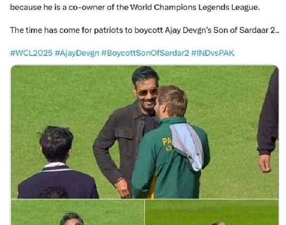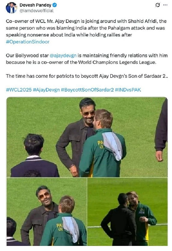ಕ್ರಿಕೆಟ್ ಮೈದಾನವೊಂದರಲ್ಲಿ ಬಾಲಿವುಡ್ ನಟ ಅಜಯ್ ದೇವಗನ್ ಅವರು ಪಾಕಿಸ್ತಾನದ ಮಾಜಿ ಕ್ರಿಕೆಟಿಗ ಶಾಹೀದ್ ಅಫ್ರಿದಿ ಅವರೊಂದಿಗೆ ಮಾತನಾಡುತ್ತಿರುವ ಫೋಟೊಗಳು ಸಾಮಾಜಿಕ ಜಾಲತಾಣಗಳಲ್ಲಿ ವ್ಯಾಪಕವಾಗಿ ಹಂಚಿಕೆಯಾಗುತ್ತಿವೆ. ಈಗ ನಡೆಯುತ್ತಿರುವ ಲೆಜೆಂಡ್ಸ್ ವಿಶ್ವ ಚಾಂಪಿಯನ್ಶಿಪ್ನ (ಡಬ್ಲ್ಯುಸಿಎಲ್) ಪಂದ್ಯದ ವೇಳೆ ಈ ಮಾತುಕತೆ ನಡೆಸಲಾಗಿದೆ ಎಂದು ಪೋಸ್ಟ್ನಲ್ಲಿ ಹೇಳಲಾಗಿದೆ.