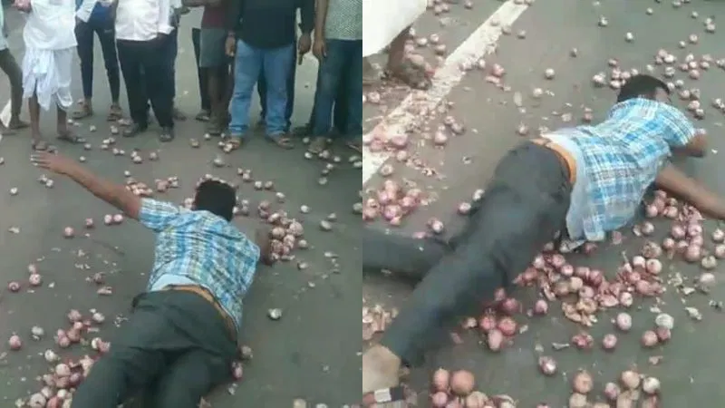 ಈರುಳ್ಳಿ ದರ ಕುಸಿತಕ್ಕೆ ಕೋಪಗೊಂಡ ರೈತ ರಾಷ್ಟ್ರೀಯ ಹೆದ್ದಾರಿಯಲ್ಲಿ ಈರುಳ್ಳಿ ಸುರಿದು ಪ್ರತಿಭಟನೆ