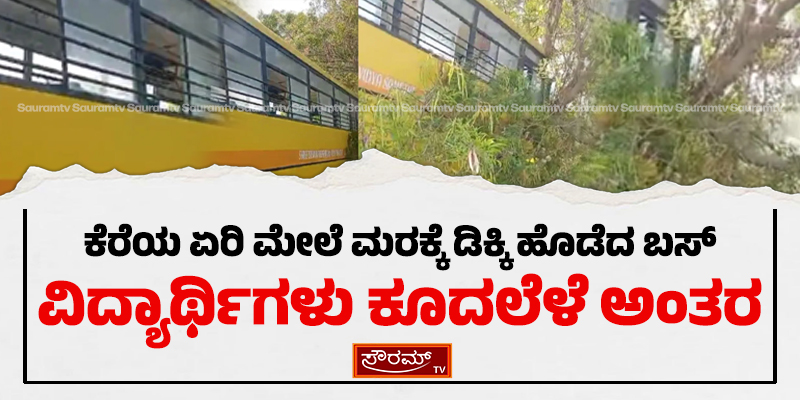 ಕೆರೆಯ ಏರಿ ಮೇಲೆ ಮರಕ್ಕೆ ಡಿಕ್ಕಿ ಹೊಡೆದ ಬಸ್ ವಿದ್ಯಾರ್ಥಿಗಳು ಕೂದಲೆಳೆ ಅಂತರ