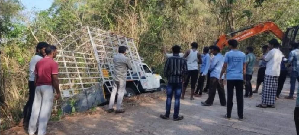 ಅಪಘಾತದಲ್ಲಿ ಚಾಲಕ ಪ್ರಾಣಾಪಾಯದಿಂದ ಪಾರಾಗಿದ್ದಾರೆ. ತಮಿಳುನಾಡು ನೋಂದಣಿಯ ಪಿಕಪ್ ಟೆಂಪೋ ಇದಾಗಿದ್ದು, ಕನ್ಯಾನ ಜಂಕ್ಷನಿಂದ ಕಳೆಂಜಿಮಲೆ ರಕ್ಷಿತಾರಣ್ಯದಲ್ಲಿ ಹಾದುಹೋಗುವ ತೀರಾ ಕಡಿದಾದ ಏರು ರಸ್ತೆಯಲ್ಲಿ, ಮುಂದಿನಿಂದ ಬರುತ್ತಿದ್ದ ಇನ್ನೊಂದು ವಾಹನಕ್ಕೆ ಸೈಡ್ ಕೊಡುವ ಸಂದರ್ಭ ಚಾಲಕನ ನಿಯಂತ್ರಣ ತಪ್ಪಿ ಟೆಂಪೋ ರಸ್ತೆ ಬದಿಗೆ ಪಲ್ಟಿಯಾಗಿದೆ. ವಾಹನದಲ್ಲಿದ್ದ ಕೋಳಿಗಳಲ್ಲಿ ಕೆಲವು ಸಾವನಪ್ಪಿದ್ದು, ಸ್ಥಳೀಯರು ಕೋಳಿಗಳನ್ನು ಹೊತ್ತೊಯ್ದಿದ್ದಾರೆ. ಚಿಕನ್ ಪ್ರಿಯರಿಗೆ ಹಬ್ಬದೂಟದ ಚಾನ್ಸ್ ಸಿಕ್ಕಿದೆ. ಕ್ರೇನ್ ಮೂಲಕ ವಾಹನವನ್ನು ಮೇಲಕ್ಕೆತ್ತಲಾಗಿದೆ