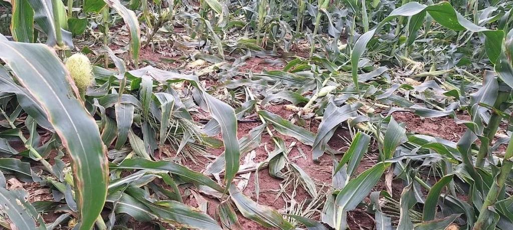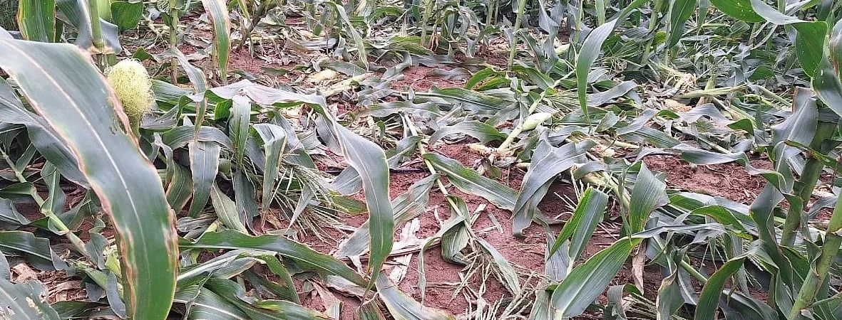 ಹಾನಿಗೊಳಗಾದ ಜೋಳದ ತೋಟವನ್ನು ವೀಕ್ಷಿಸುತ್ತಿರುವ ರೈತರು