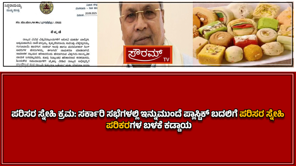 ಪರಿಸರ ಸ್ನೇಹಿ ಕ್ರಮ: ಸರ್ಕಾರಿ ಸಭೆಗಳಲ್ಲಿ ಇನ್ನುಮುಂದೆ ಪ್ಲಾಸ್ಟಿಕ್ ಬದಲಿಗೆ ಪರಿಸರ ಸ್ನೇಹಿ ಪರಿಕರಗಳ ಬಳಕೆ ಕಡ್ಡಾಯ.