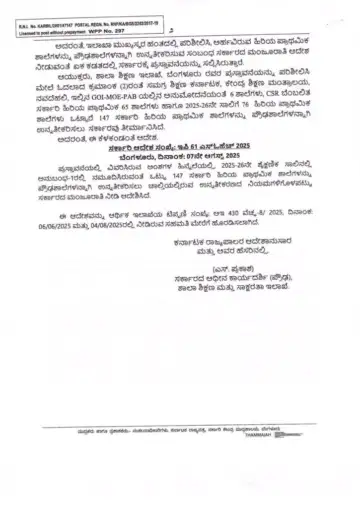 ಪ್ರಸ್ತಾವನೆಯಲ್ಲಿ ವಿವರಿಸಿರುವ ಅಂಶಗಳ ಹಿನ್ನೆಲೆಯಲ್ಲಿ 2025-26ನೇ ಶೈಕ್ಷಣಿಕ ಸಾಲಿನಲ್ಲಿ ಅನುಬಂಧ-1ರಲ್ಲಿ ನಮೂದಿಸಿರುವಂತೆ ಒಟ್ಟು 147 ಸರ್ಕಾರಿ ಹಿರಿಯ ಪ್ರಾಥಮಿಕ ಶಾಲೆಗಳನ್ನು ಪ್ರೌಢಶಾಲೆಗಳನ್ನಾಗಿ ಉನ್ನತೀಕರಿಸಲು ಚಾಲ್ತಿಯಲ್ಲಿರುವ ಉನ್ನತೀಕರಣದ ನಿಯಮಗಳಿಗೊಳಪಟ್ಟು ಸರ್ಕಾರದ ಮಂಜೂರಾತಿ ನೀಡಿ ಆದೇಶಿಸಿದೆ.ಈ ಆದೇಶವನ್ನು ಆರ್ಥಿಕ ಇಲಾಖೆಯ ಟಿಪ್ಪಣಿ ಸಂಖ್ಯೆ: ಆಇ 430 ವೆಚ್ಚ-8/ 2025, ದಿನಾಂಕ: 06/06/2025 ಮತ್ತು 04/08/2025ರಲ್ಲಿ ನೀಡಿರುವ ಸಹಮತಿ ಮೇರೆಗೆ ಹೊರಡಿಸಲಾಗಿದೆ.