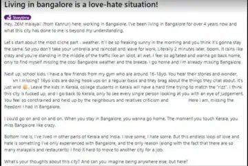 ಮೂಲತಃ ಕಣ್ಣೂರಿನವರಾದ ಯುವಕ, ತಮ್ಮ ತವರು ಕೇರಳ ಮತ್ತು ಬೆಂಗಳೂರಿನ ನಡುವಿನ ಅನುಭವವನ್ನು ಹಂಚಿಕೊಂಡಿದ್ದಾರೆ. ನಾನು ನಾಲ್ಕು ವರ್ಷಗಳಿಂದ ಬೆಂಗಳೂರಿನಲ್ಲಿ ವಾಸಿಸುತ್ತಿದ್ದೇನೆ. ಈ ನಗರವು ನನಗೆ ಏನು ಮಾಡಿದೆ ಎಂಬುದು ನನ್ನ ತಿಳುವಳಿಕೆಯನ್ನು ಮೀರಿದೆ” ಎಂದು ಹೇಳಿಕೊಂಡಿದ್ದಾರೆ.