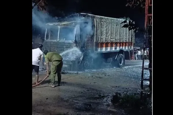 ಗೋಮಾಂಸ ಸಾಗಿಸುತ್ತಿದ್ದ ಲಾರಿಗೆ ಬೆಂಕಿ ಹಚ್ಚಿದ ದುಷ್ಕರ್ಮಿಗಳು, ವಾಹನ ಸಂಪೂರ್ಣ ಸುಟ್ಟು ಕರಕಲು