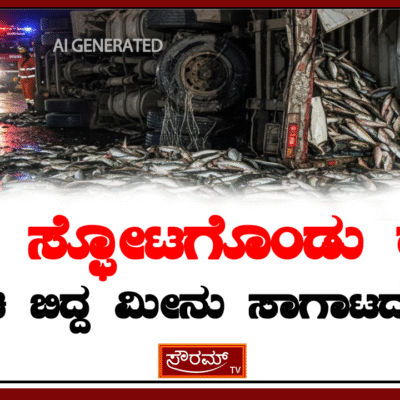 ಟೈರ್ ಸ್ಫೋಟಗೊಂಡು ರಸ್ತೆಗೆ ಮಗುಚಿ ಬಿದ್ದ ಮೀನು ಸಾಗಾಟದ ಲಾರಿ