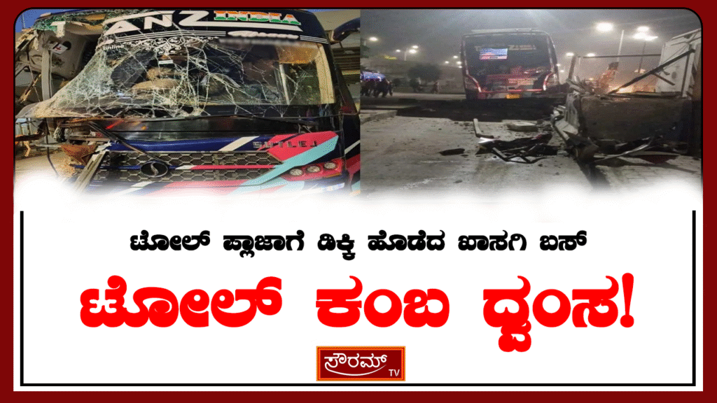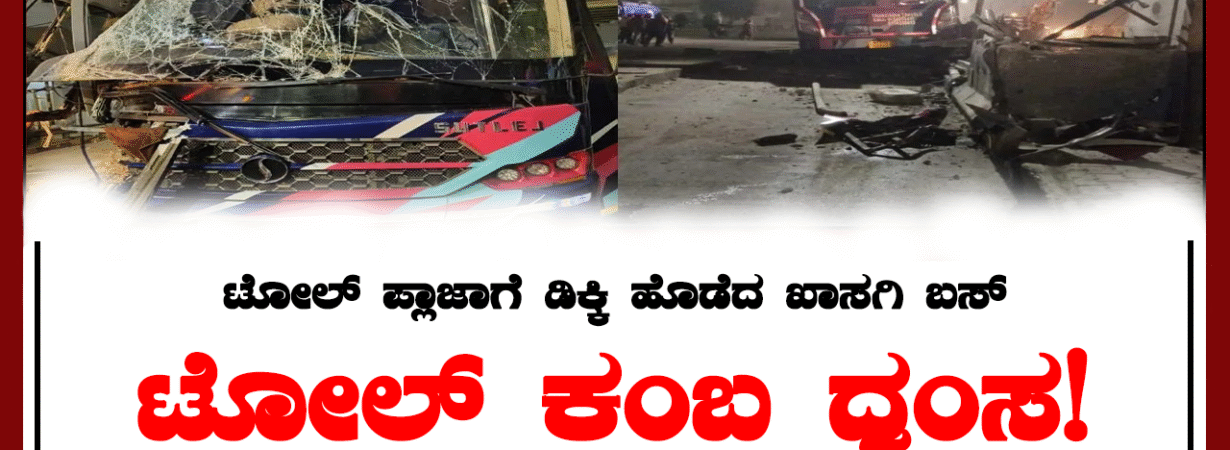 ಟೋಲ್ ಪ್ಲಾಜಾಗೆ ಡಿಕ್ಕಿ ಹೊಡೆದ ಖಾಸಗಿ ಬಸ್; ಟೋಲ್ ಕಂಬ ಧ್ವಂಸ!