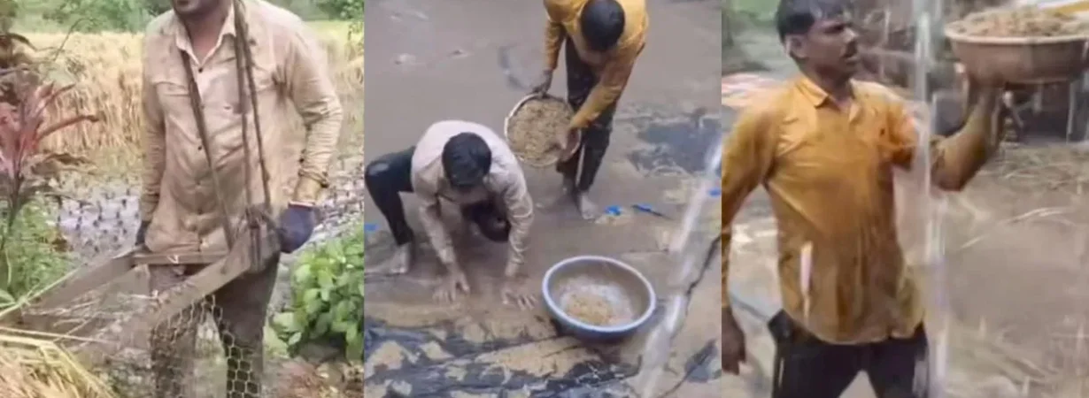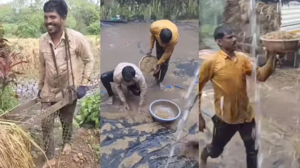 gowrishkothari ಹೆಸರಿನ ಎಕ್ಸ್ ಖಾತೆಯಲ್ಲಿ ಹಂಚಿಕೊಳ್ಳಲಾದ ಈ ವಿಡಿಯೋದಲ್ಲಿ ರೈತನ ಬದುಕಿನ ಸ್ಪಷ್ಟ ಚಿತ್ರಣ ಇಲ್ಲಿದೆ. ಮಳೆಯಿಂದ ಹಾಳಾದ ಬೆಳೆಯನ್ನು ಮನೆಯ ಅಂಗಳಕ್ಕೆ ತರುವುದನ್ನು ಕಾಣಬಹುದು. ಕಷ್ಟ ಪಟ್ಟು ಬೆವರು ಸುರಿಸಿ ಬೆಳೆದ ಬೆಳೆಯೂ ಹಾಳಾಗಿದ್ರೂ ಕೂಡ ಈ ರೈತರ ಮುಖದಲ್ಲಿ ಮಾತ್ರ ನಗು ಮಾಸದಿರುವುದನ್ನು ಕಾಣಬಹುದು. ಮನೆಯ ಅಂಗಳದಲ್ಲಿ ಭತ್ತವನ್ನು ಪೈರಿನಿಂದ ಬೇರ್ಪಡಿಸುತ್ತಿರುವ ಕೆಲಸದಲ್ಲಿ ರೈತರು ತೊಡಗಿಕೊಂಡಿದ್ದಾರೆ. ಆದರೆ, ಜೋರಾಗಿ ಸುರಿಯುತ್ತಿರುವ ಮಳೆಗೆ ಭತ್ತವೆಲ್ಲಾ ಒದ್ದೆಯಾಗಿ ನೀರಲ್ಲಿ ಕೊಚ್ಚಿಕೊಂಡು ಹೋಗುತ್ತಿದೆ. ಈ ಭತ್ತವನ್ನು ನೀರಿನಿಂದ ಬೇರ್ಪಡಿಸಿ ಬುಟ್ಟಿಯಲ್ಲಿ ತುಂಬಿಸಿರುತ್ತಿರುವುದನ್ನು ಕಾಣಬಹುದು.