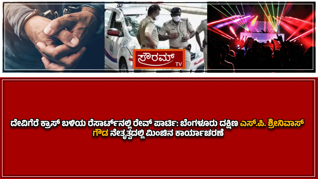 ದೇವಿಗೆರೆ ಕ್ರಾಸ್ ಬಳಿಯ ರೆಸಾರ್ಟ್ನಲ್ಲಿ ರೇವ್ ಪಾರ್ಟಿ: ಬೆಂಗಳೂರು ದಕ್ಷಿಣ ಎಸ್.ಪಿ. ಶ್ರೀನಿವಾಸ್ ಗೌಡ ನೇತೃತ್ವದಲ್ಲಿ ಮಿಂಚಿನ ಕಾರ್ಯಾಚರಣೆ.