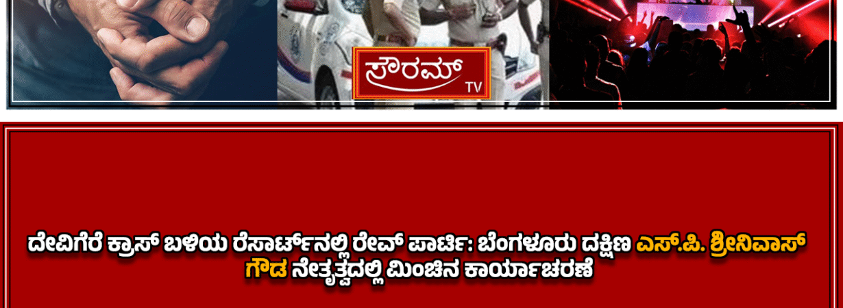ದೇವಿಗೆರೆ ಕ್ರಾಸ್ ಬಳಿಯ ರೆಸಾರ್ಟ್ನಲ್ಲಿ ರೇವ್ ಪಾರ್ಟಿ: ಬೆಂಗಳೂರು ದಕ್ಷಿಣ ಎಸ್.ಪಿ. ಶ್ರೀನಿವಾಸ್ ಗೌಡ ನೇತೃತ್ವದಲ್ಲಿ ಮಿಂಚಿನ ಕಾರ್ಯಾಚರಣೆ.