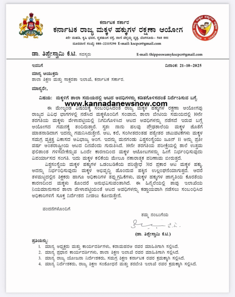 ಈ ಕುರಿತಂತೆ ಕರ್ನಾಟಕ ರಾಜ್ಯ ಮಕ್ಕಳ ಹಕ್ಕುಗಳ ಆಯೋಗದ ಸದಸ್ಯ ಡಾ.ಕೆ.ಟಿ ತಿಪ್ಪೇಸ್ವಾಮಿ ಅವರು, ಶಾಲಾ ಶಿಕ್ಷಣ ಮತ್ತು ಸಾಕ್ಷರತಾ ಇಲಾಖೆಯ ಆಯುಕ್ತರಿಗೆ ಪತ್ರ ಬರೆದಿದ್ದಾರೆ. ಅದರಲ್ಲಿ ರಾಜ್ಯ ಮಕ್ಕಳ ಹಕ್ಕುಗಳ ರಕ್ಷಣಾ ಆಯೋಗವು ರಾಜ್ಯದ ವಿವಿಧ ಭಾಗಗಳಲ್ಲಿ ನಡೆಸಿದ ಮಕ್ಕಳೊಂದಿಗೆ ಸಂವಾದ, ಶಾಲಾ ಭೇಟಿಯ ಸಮಯದಲ್ಲಿ 10ನೇ ತರಗತಿಯ ಮಕ್ಕಳು ವೇಳಾಪಟ್ಟಿಯಲ್ಲಿ ನಿಗದಿಗೊಳಿಸಿದ ಆಟದ ಅವಧಿಗಳನ್ನು ನಡೆಸದೆ ಇರುವ ಬಗ್ಗೆ ಆಯೋಗದ ಗಮನಕ್ಕೆ ತಂದಿರುತ್ತಾರೆ ಎಂದಿದ್ದಾರೆ.