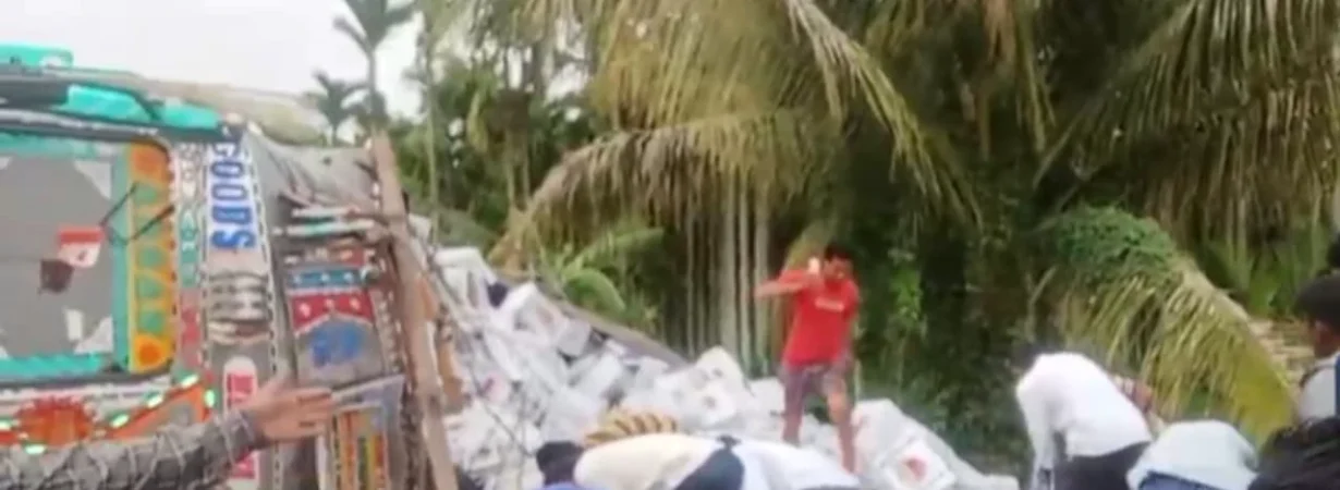 ಶಿರಾ ಬಳಿ ಸೇಬು ತುಂಬಿದ ಲಾರಿ ಪಲ್ಟಿ: ರಸ್ತೆಗೆ ಚೆಲ್ಲಿದ ಲಕ್ಷಾಂತರ ಮೌಲ್ಯದ ಹಣ್ಣು, ಜನರು ಎತ್ತಿಕೊಂಡು ಹೋದರು!