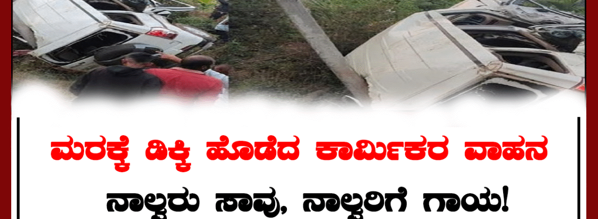 ಮರಕ್ಕೆ ಡಿಕ್ಕಿ ಹೊಡೆದ ಕಾರ್ಮಿಕರ ವಾಹನ; ನಾಲ್ವರು ಸಾವು, ನಾಲ್ವರಿಗೆ ಗಾಯ!
